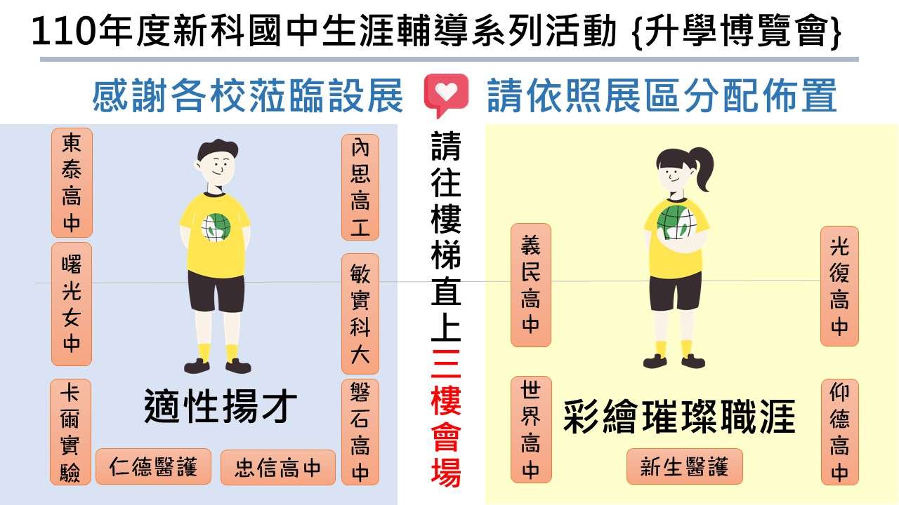 - 本校110年度升學博覽會,部分展區位置有更改,屆時請以校內配置圖為準進行布置。