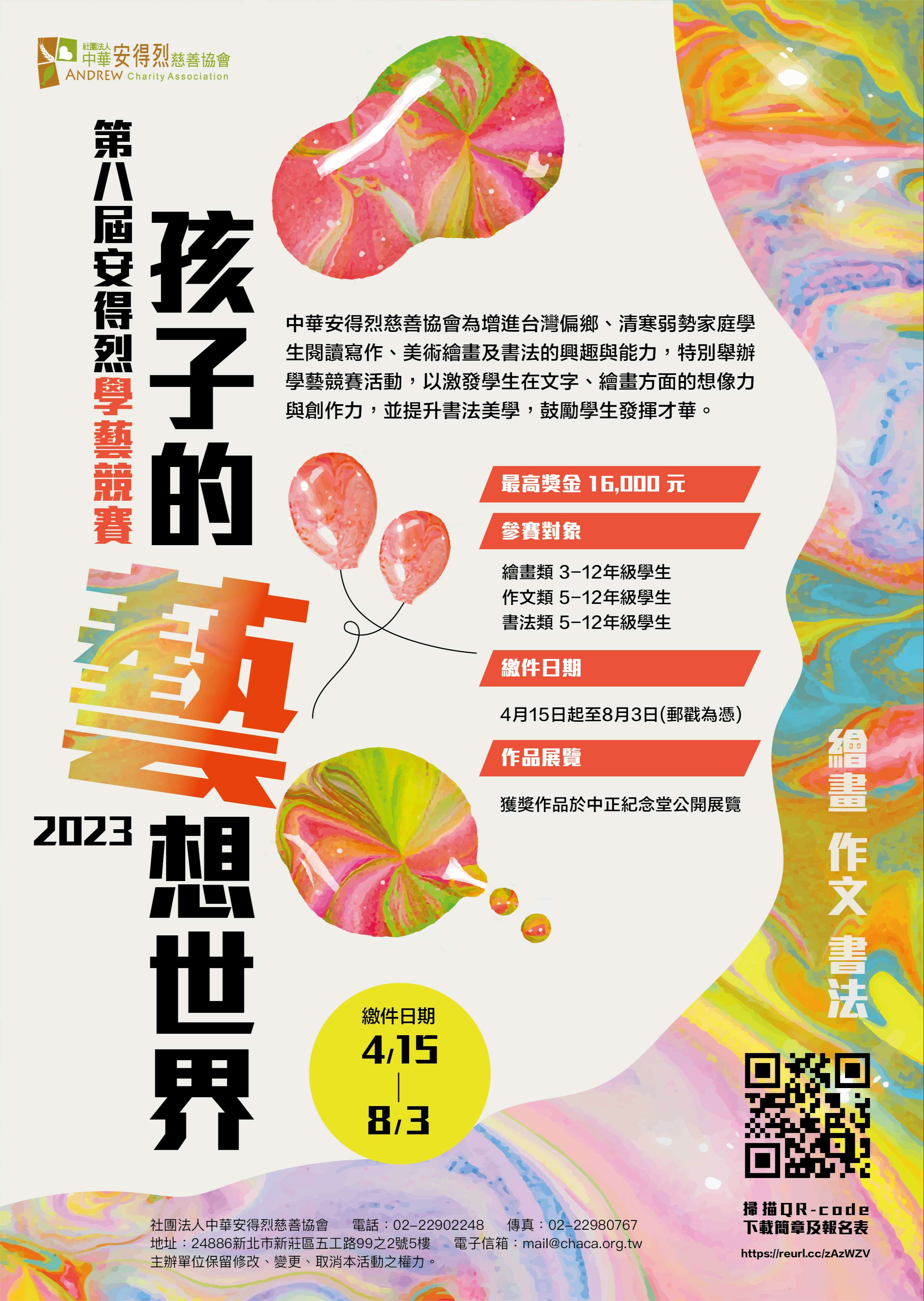 一、 | 本會為增進台灣偏鄉、清寒弱勢家庭學生閱讀寫作、美術繪畫及書法的興趣與能力,特別舉辦學藝競賽活動,以激發學生在文字、繪畫方面的想像力與創作力,並提升書法美學,鼓勵學生發揮才華。 |