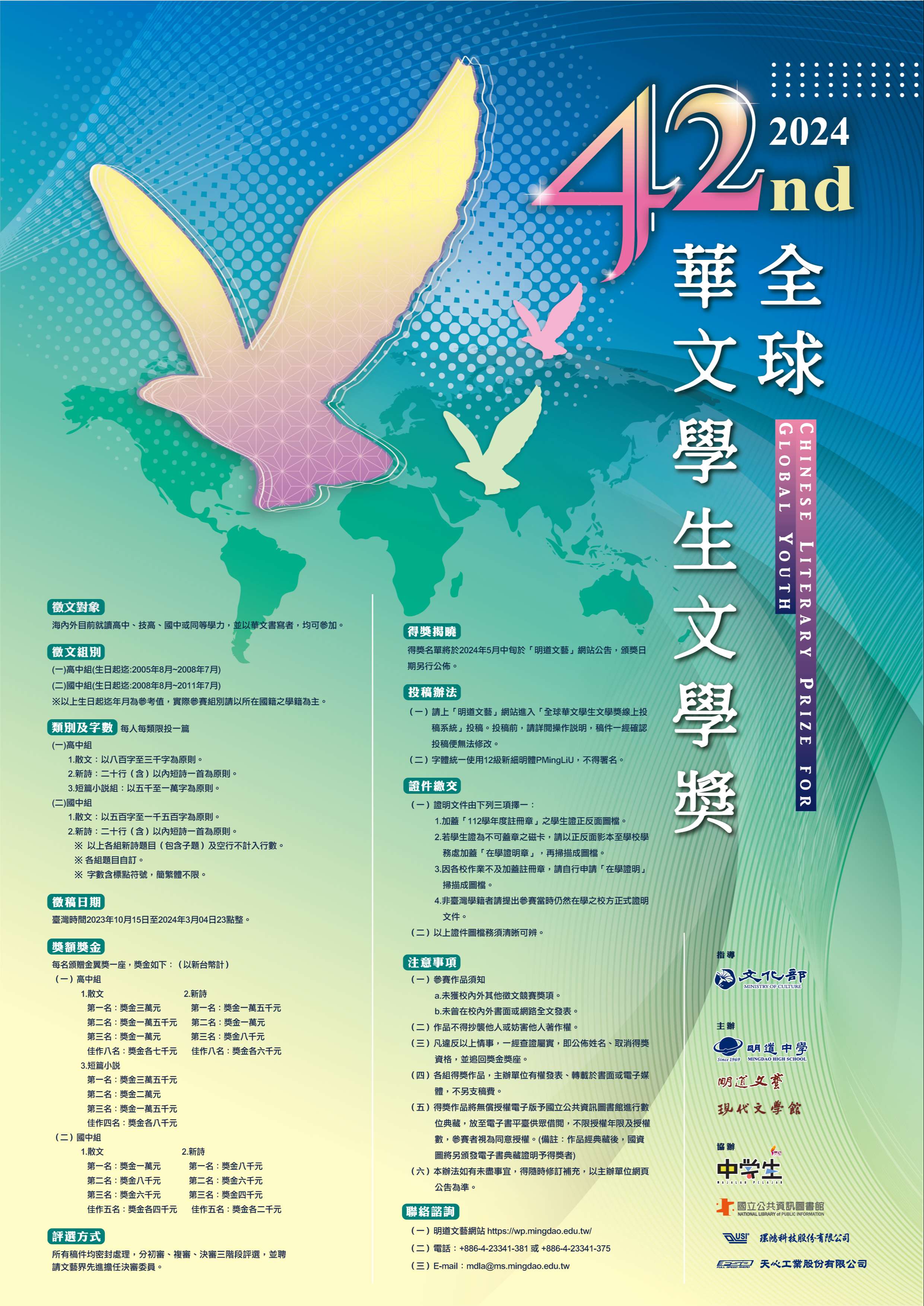 一、 | 「第42屆全球華文學生文學獎」徵文對象為海內外目前就讀高中職、國中或同等學力,並以華文書寫者,均可參加。 |