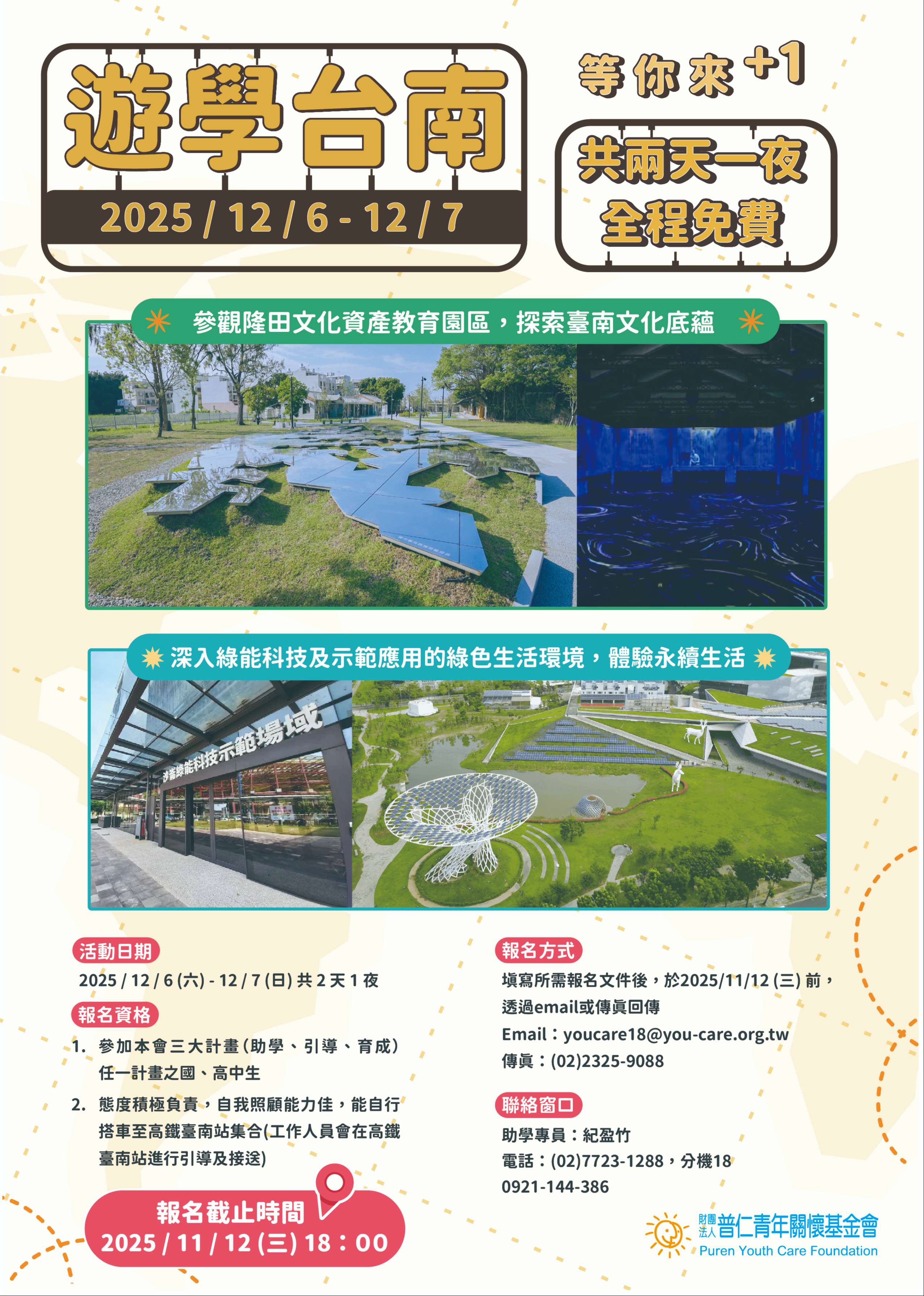 一、 本會將於2025年12月6日(六)至12月7日(日),舉辦2025年遊學臺南青少年體驗活動,費用全免,凡參與本會助學計畫、引導計畫或育成計畫之國、高中生皆可報名。