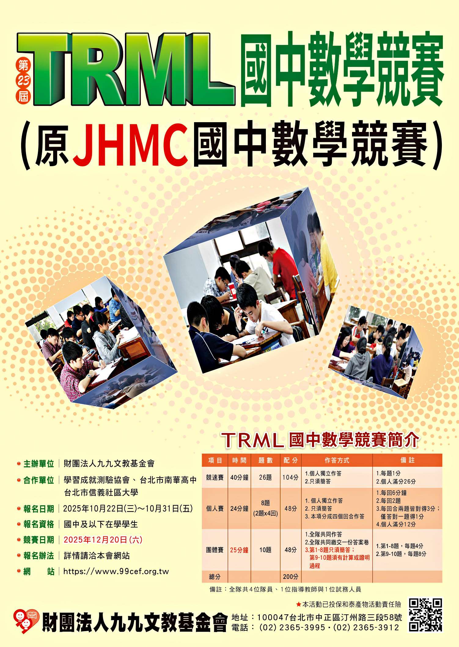 主旨: | 本會訂於2025年12月20日(星期六)舉辦第23屆TRML國中數學競賽 (原JHMC國中數學競賽) ,敬請 貴校鼓勵學生報名參加,參賽成績優異之學生與指導教師,依例酌予敘獎鼓勵。 |