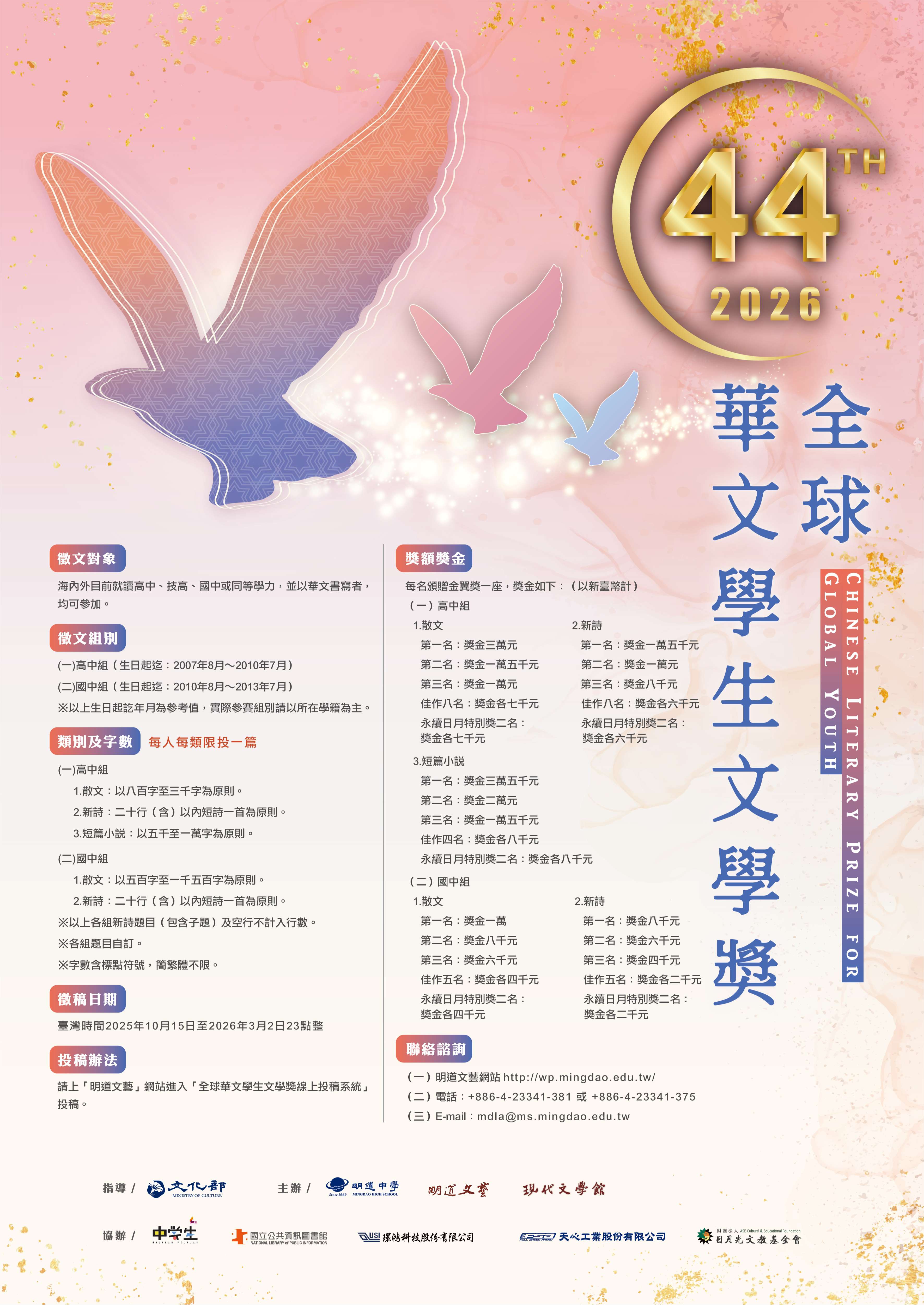 一、 | 「第44屆全球華文學生文學獎」徵文對象為海內外目前就讀高中職、國中或同等學力,並以華文書寫者,均可參加。 |