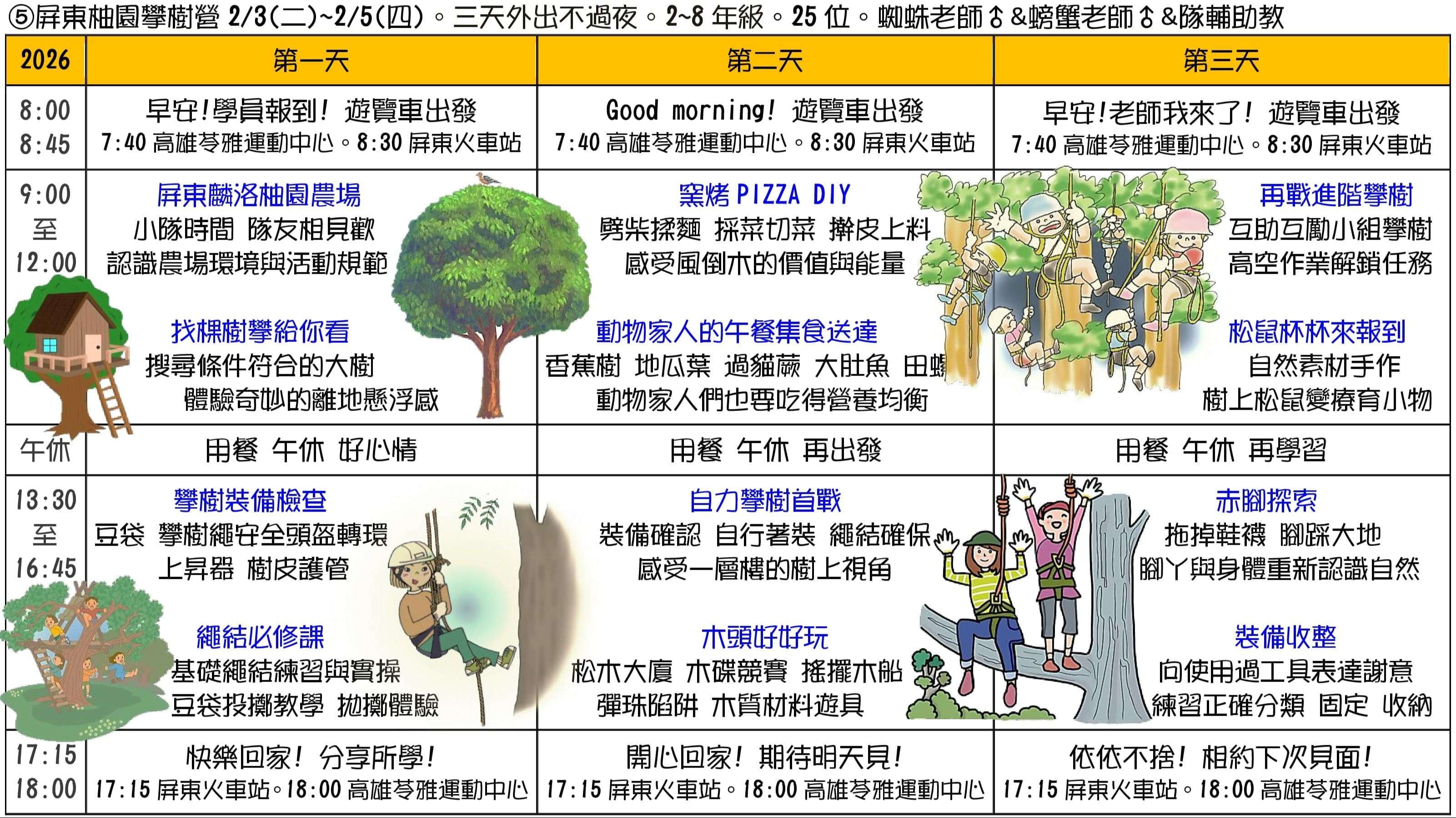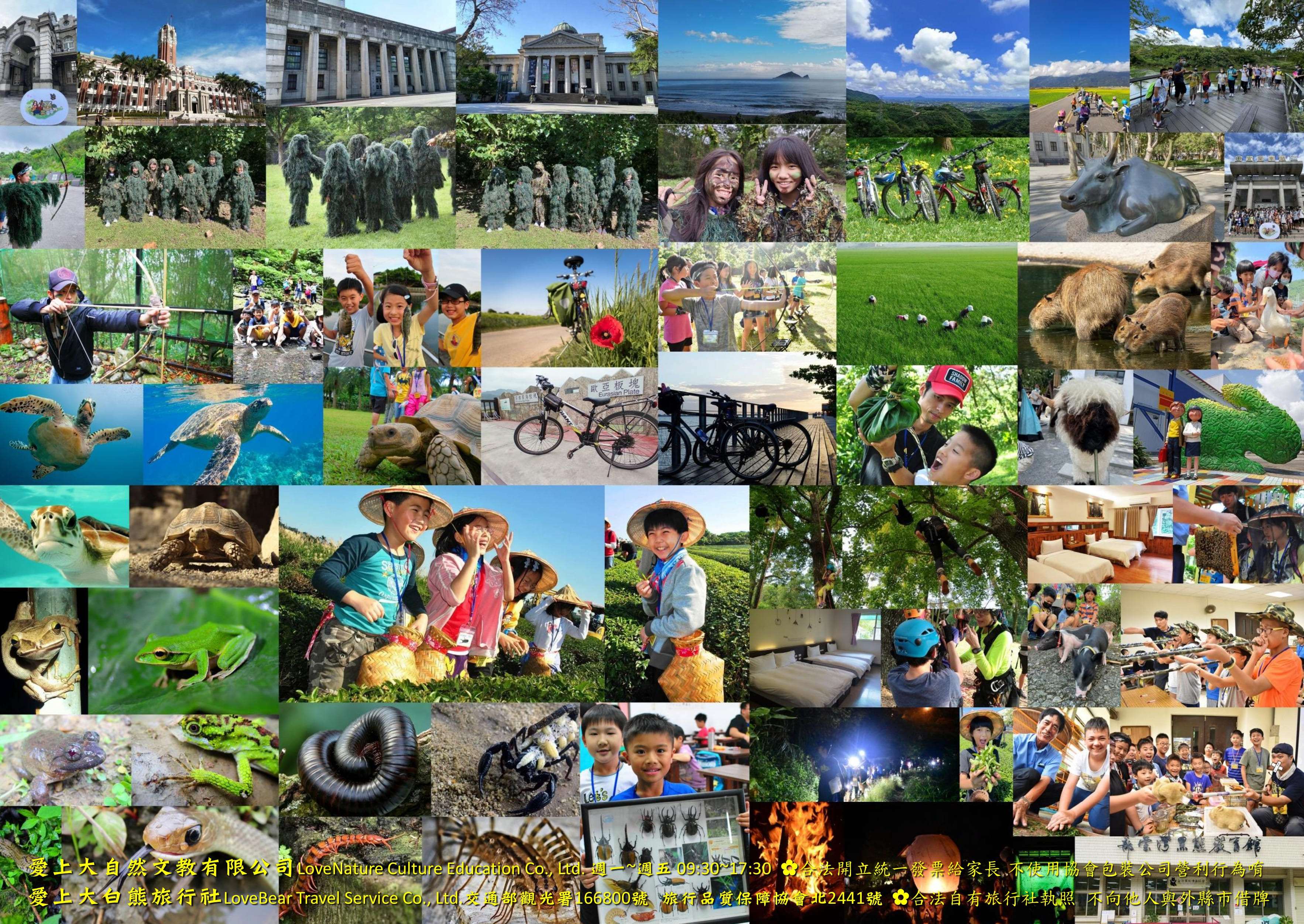 二、 課程主題:①蘭陽山野求生營(5天4夜)、②小琉球海龜營(5天4夜)、③宜蘭生態農場營(3天2夜)、④TPE博物館生態營(3天外出不過夜)、⑤屏東柚園攀樹營(3天外出不過夜)、⑥節肢小怪獸營(3天大學不過夜)、⑦池上單車生態營(4天3夜)。