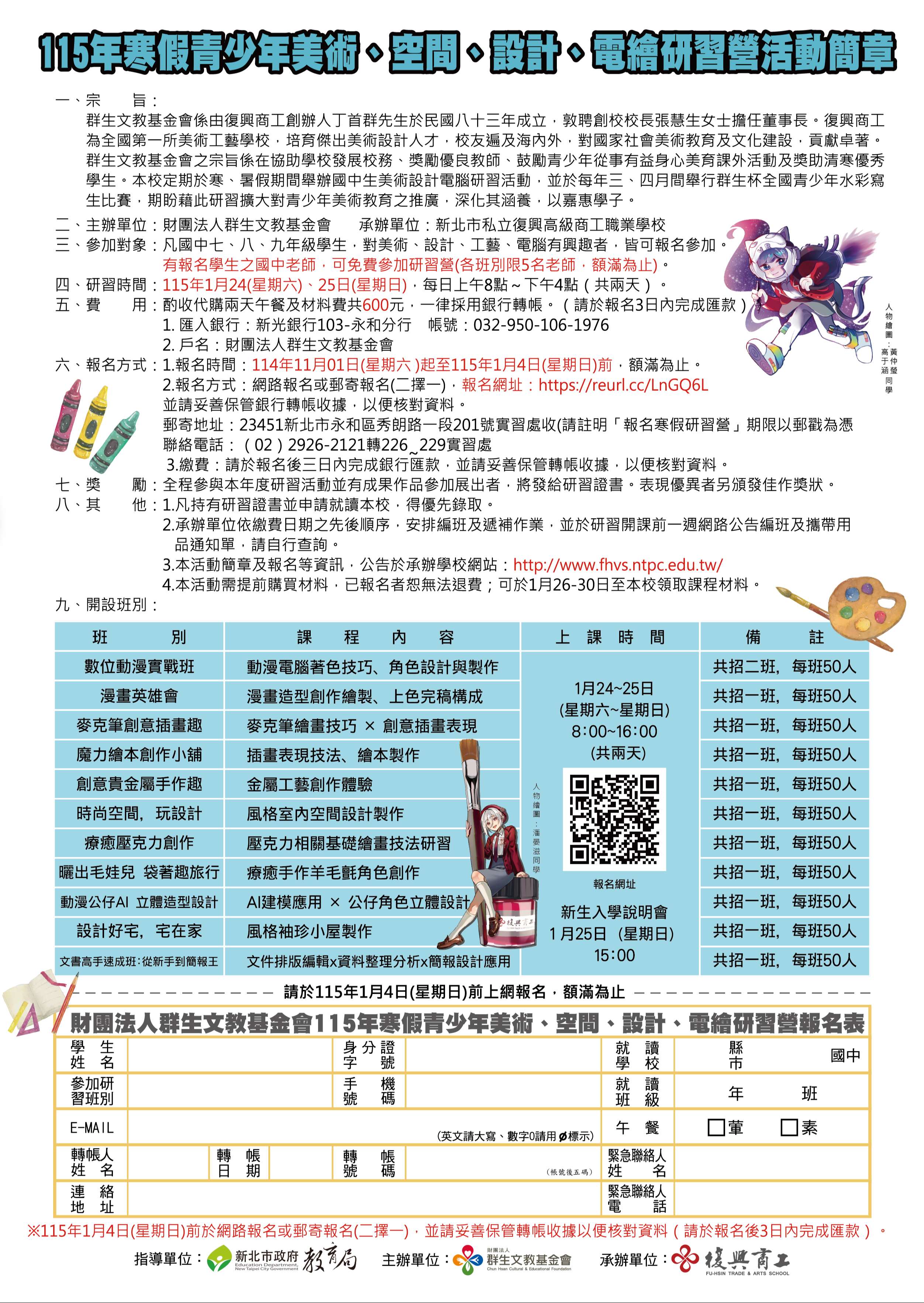 轉知: 新北市私立復興高級商工職業學校承辦財團法人群生文教基金會「115年寒假青少年美術、空間、設計、電繪研習營」活動簡章。
