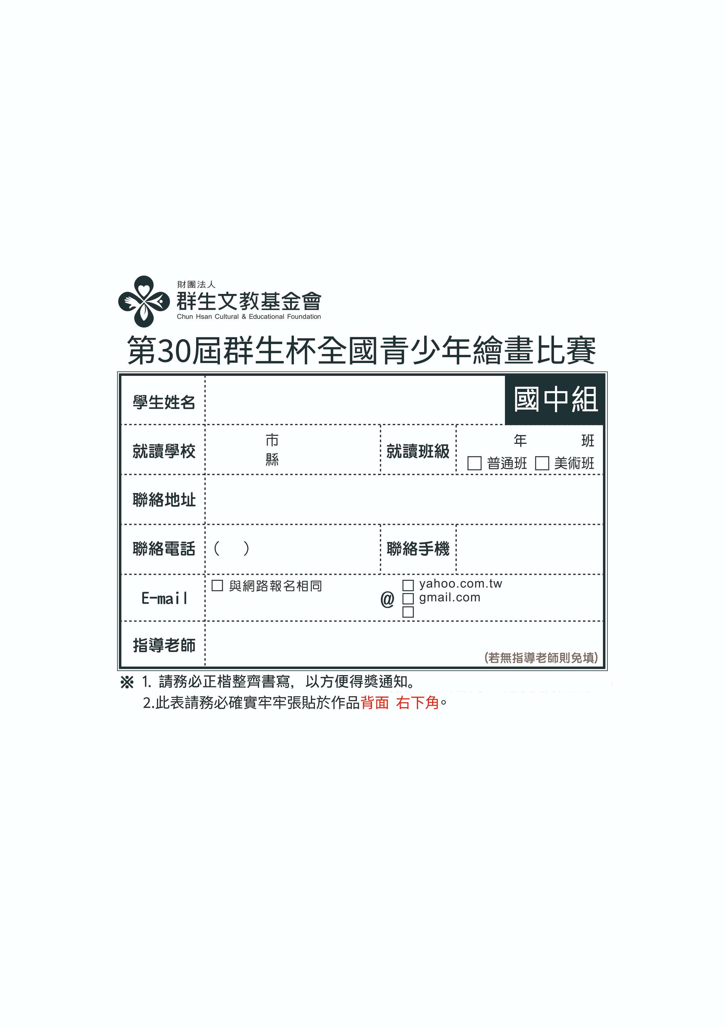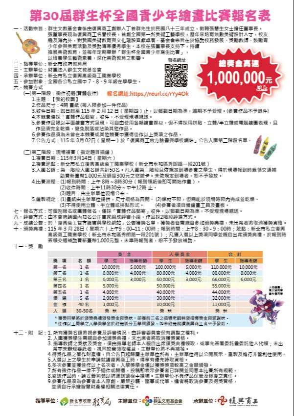 主旨: 新北市私立復興高商工承辦財團法人群生文教基金會「第30屆群生杯全國青少年繪畫比賽」簡章,敬請 惠予宣導,鼓勵學生踴躍參加,請查照。