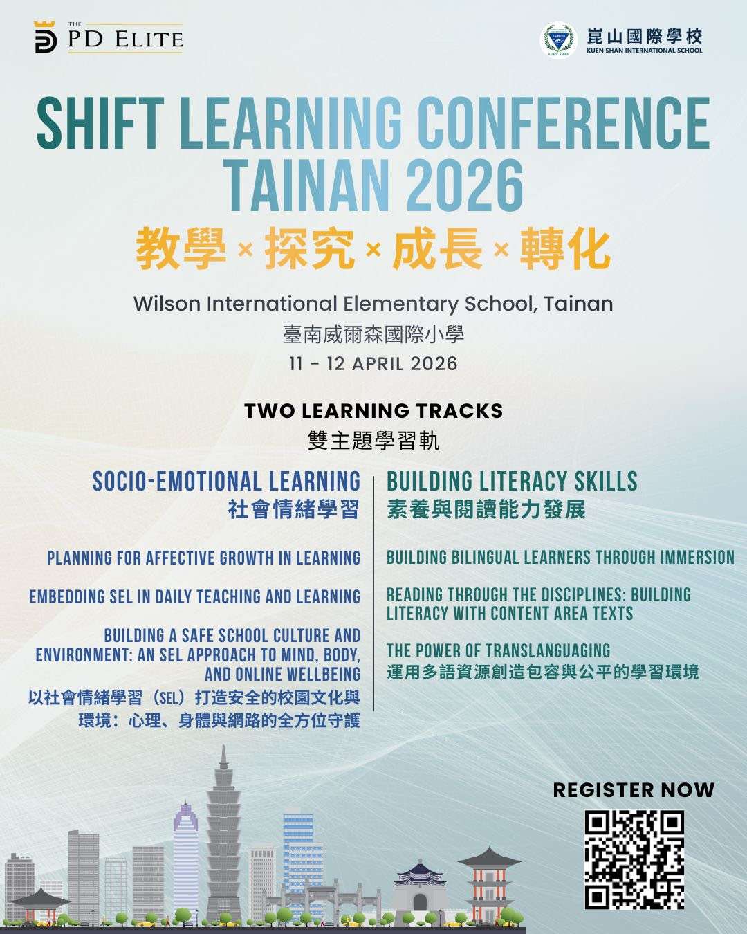 | 三、 | 本校為促進教師專業發展並引進國際教育專業資源,特與PD-Elite合作共同辦理《Shift Learning Conference Tainan 2026》國際教育研習活動,研習訂於2026年4月11日至4月12日於臺南市威爾森國際國民小學(Wilson International Elementary School, Tainan)舉行,為全臺灣少數為所有學習階段教育工作者辦理的全英語研習,機會難得。 |